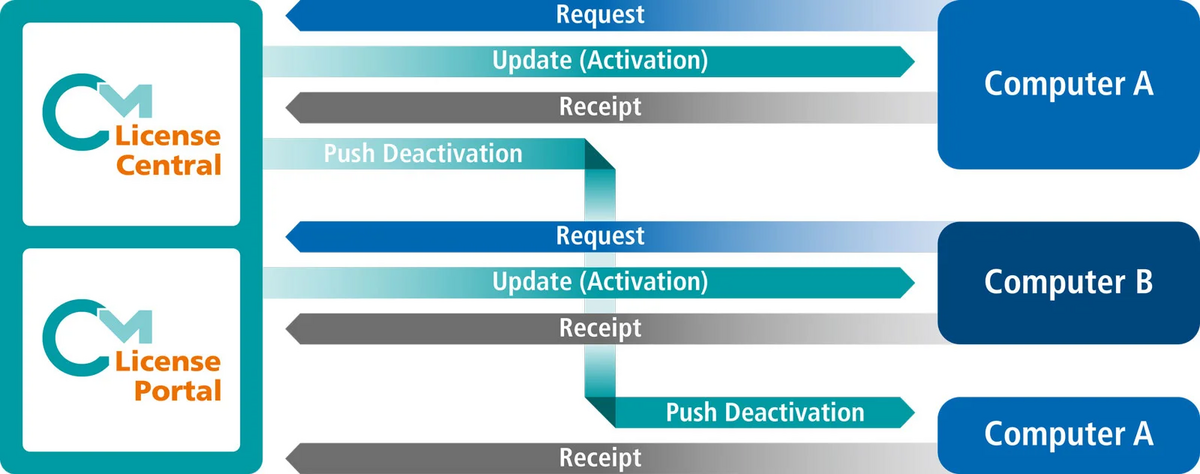 As long as no receipt confirming execution of the push update is received, CodeMeter License Central will repeatedly deliver the push update whenever any programming action occurs on that computer (more precisely, within that CmActLicense). This means that at the next opportunity, the license is removed from the old computer, without penalizing the user for further use of that machine.